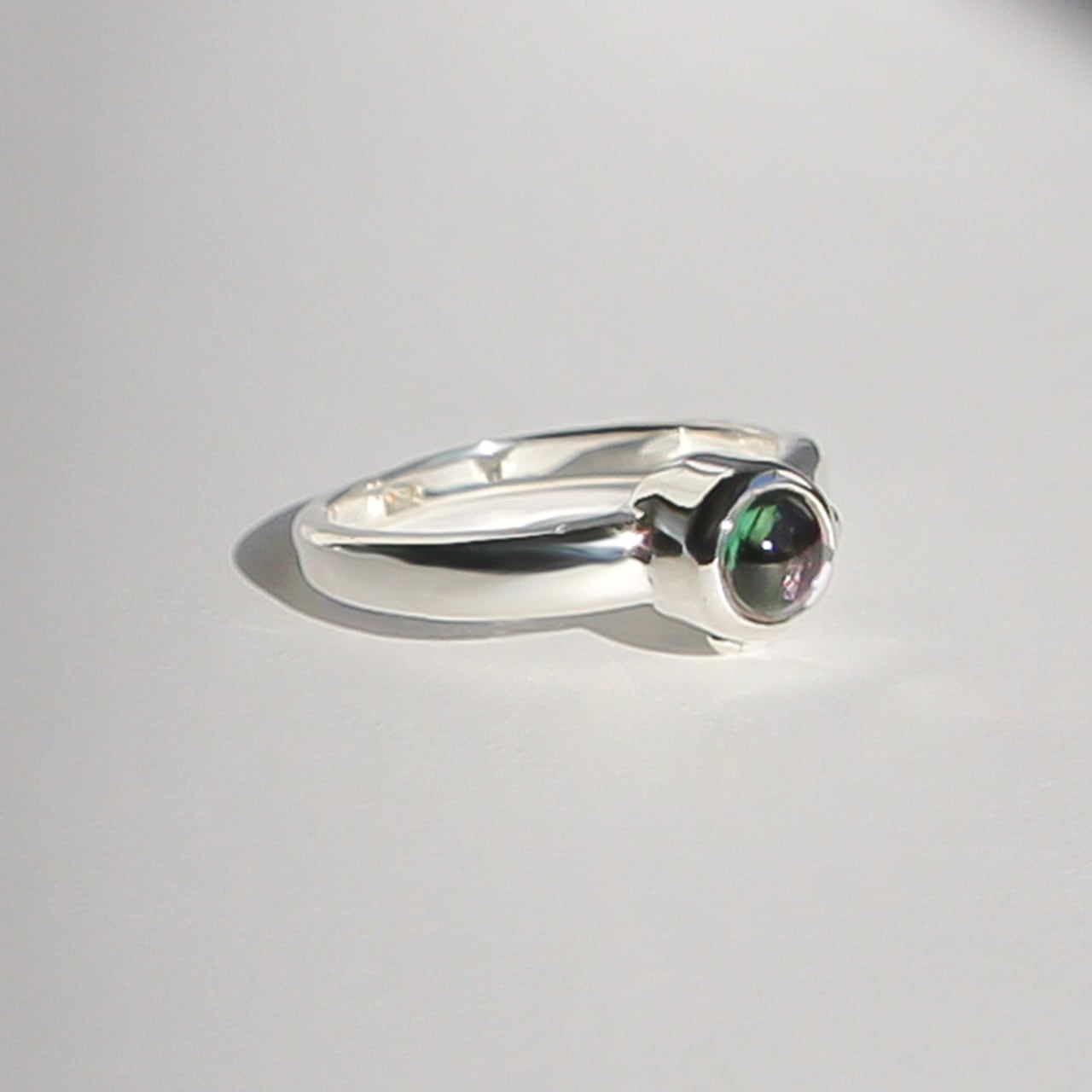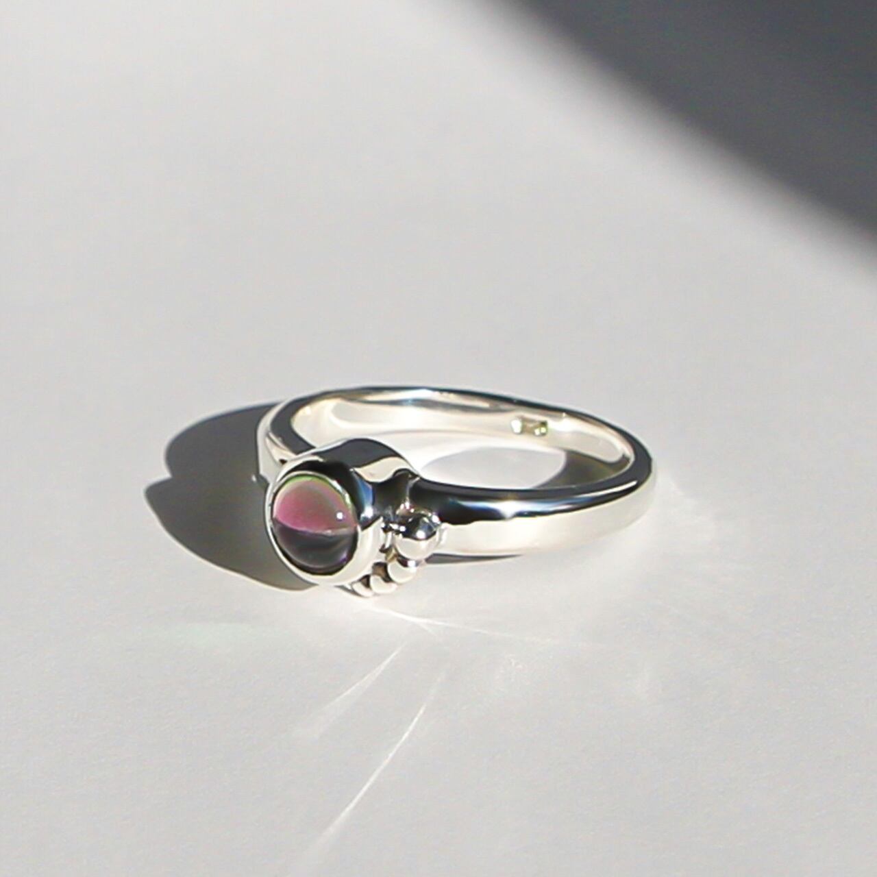 指を傾ける度に色が変わるバイカラートルマリンを装飾したリングです。