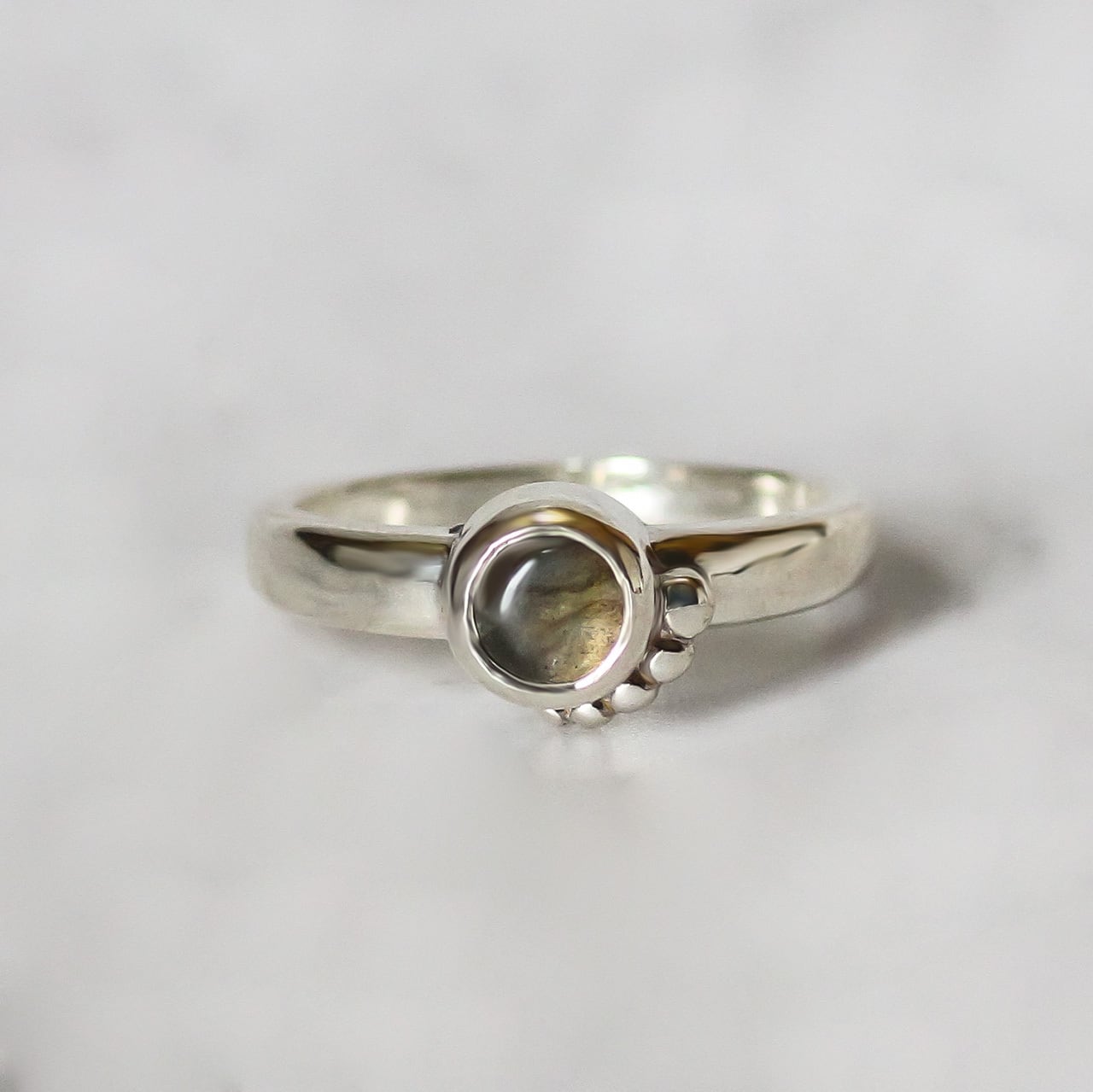 深い輝きを放つラブラドライトを装飾したシルバーリングです。シンプルながらも存在感のあるデザインが手元を美しく演出します。