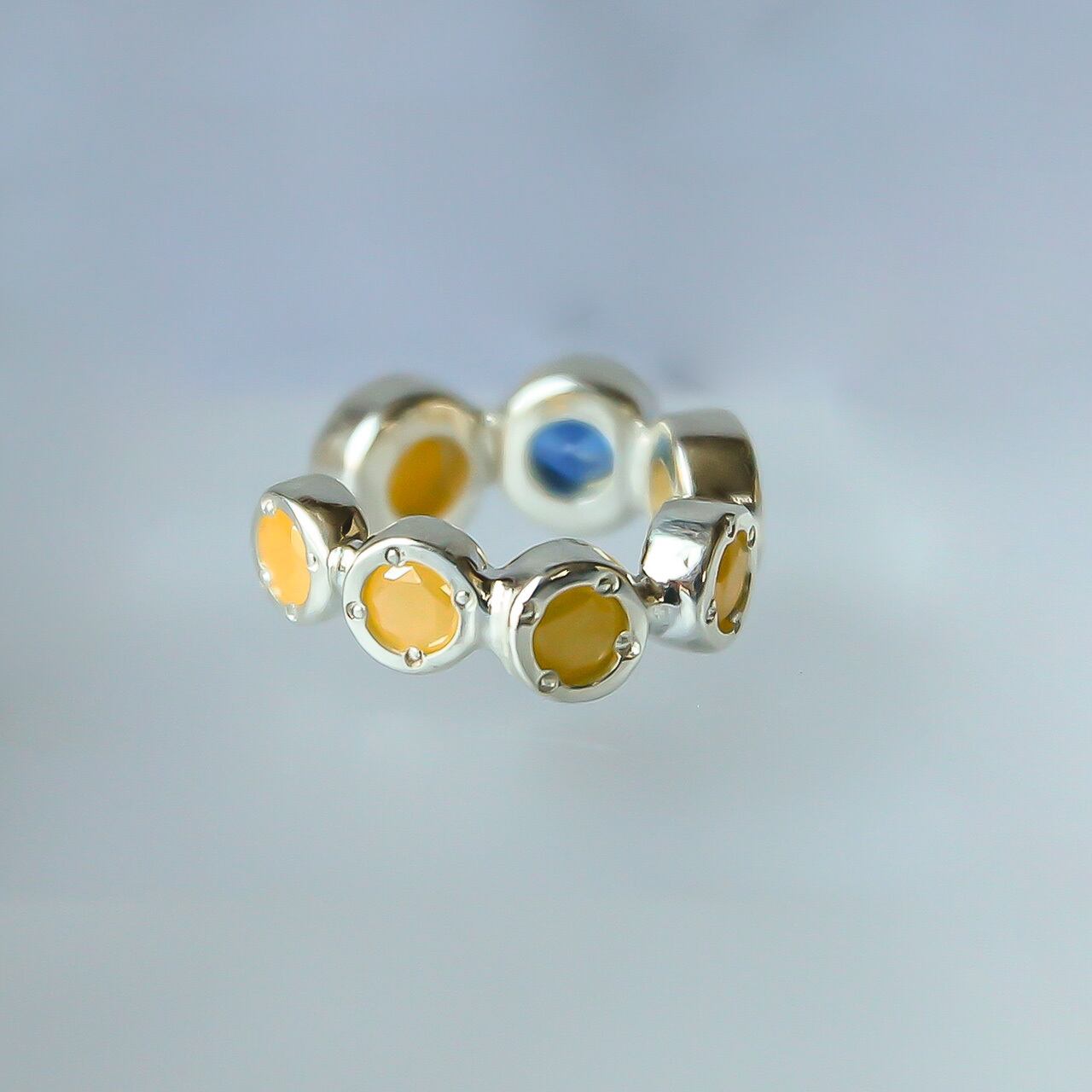 ミルキーイエローとブルーのジルコニアを使用したブルーの差し色が個性的な印象を持たせるイヤカフ。