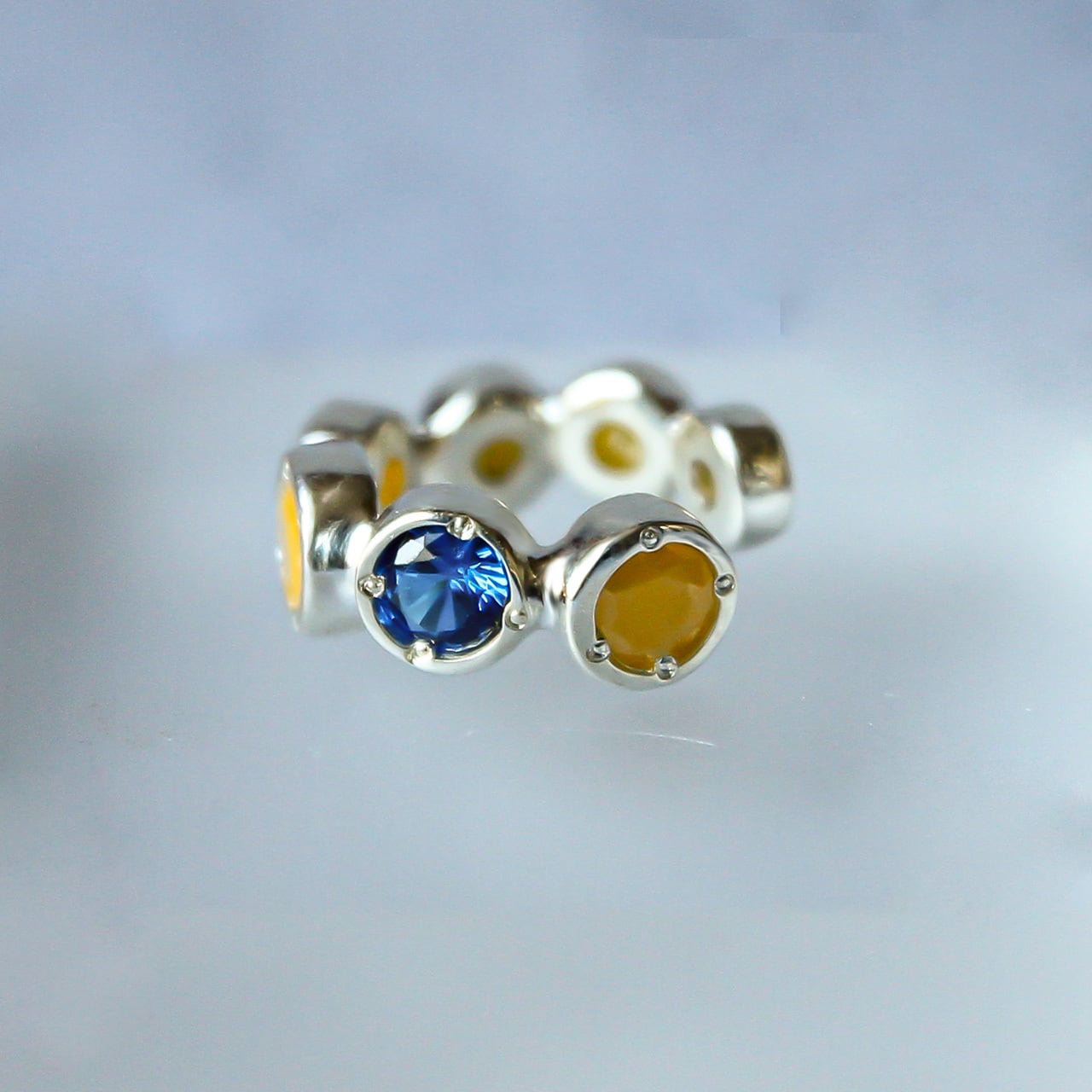 ミルキーイエローとブルーのジルコニアを使用したブルーの差し色が個性的な印象を持たせるイヤカフ。
